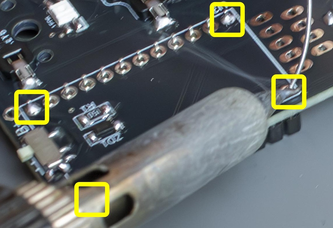 The second components we're adding are the underglow LEDs. We'll begin by again, applying a small amount of solder to one of the pads as shown below: