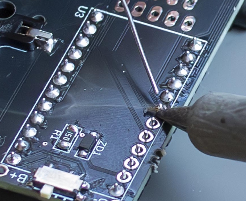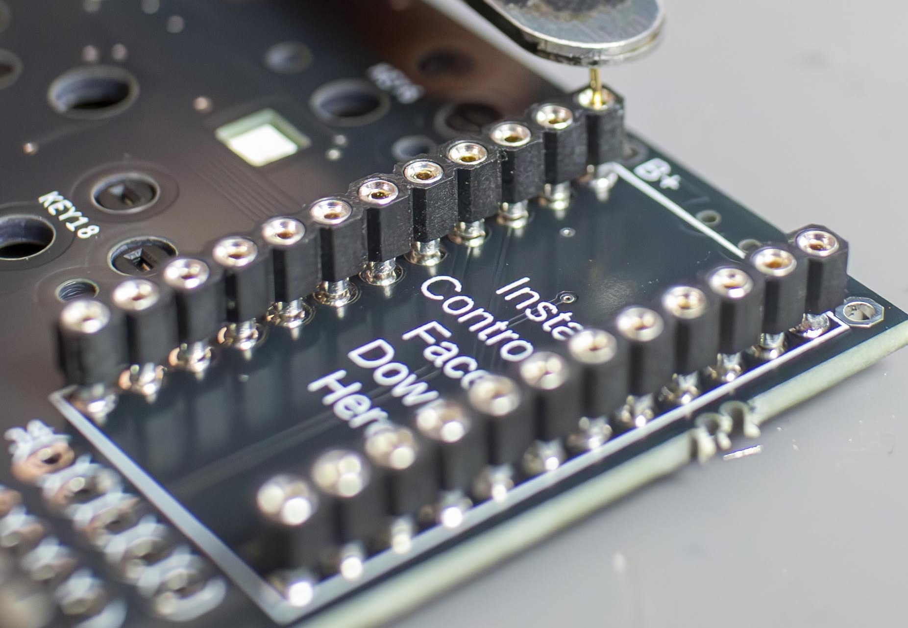 Once we've got the pins into position we can place the controllers component side down onto the pins/sockets, from here we can solder the controller to the pins (being careful not to heat them for too long, as this can cause the solder to travel down the pin and flood the socket):