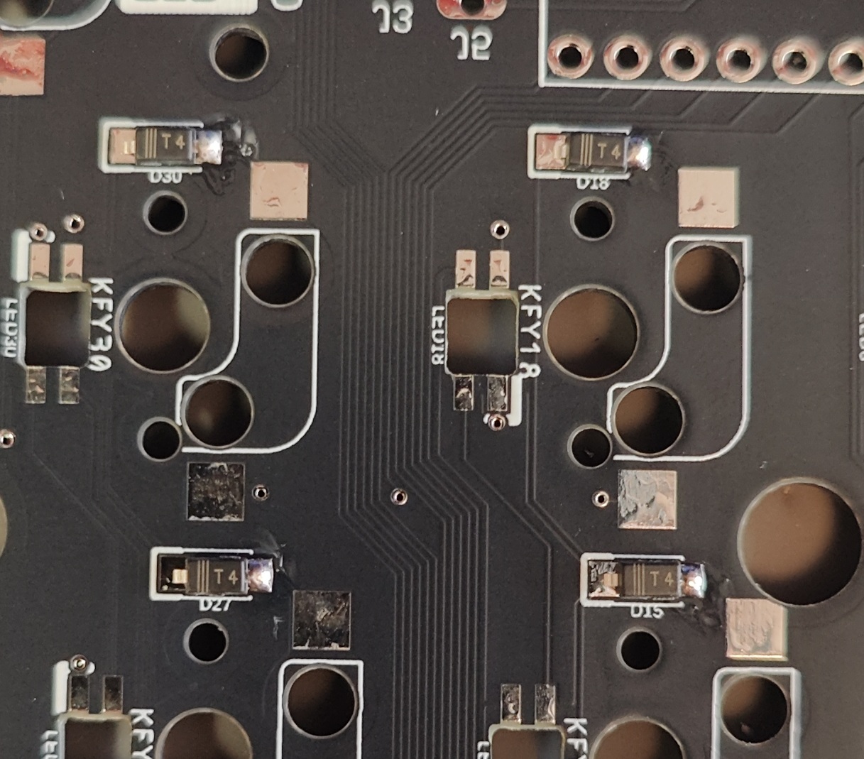 Now for the hotswap sockets, I tend to find it easiest to place all of the sockets in their outlined positions and then solder them into place one side at a time. but you can also use the same method as previous components!