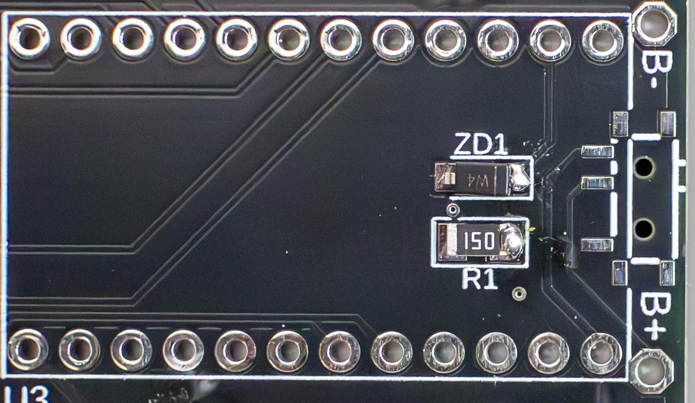 First up the zener diode and resistor, this is the same process as the diodes, although we don't have to worry about the resistor orientation, so it has slightly different PCB markings (The line on the zener diode should be facing the line on the PCB)