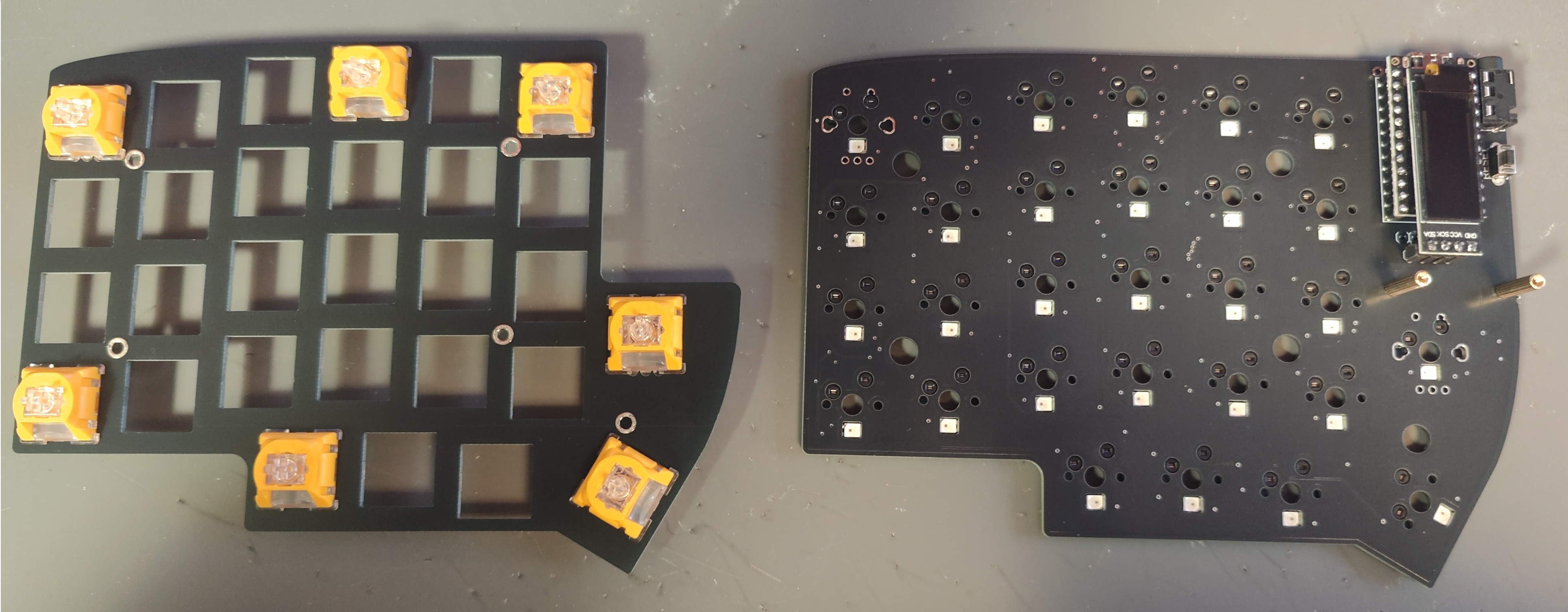 We can now finish assembling the case by placing the PCB and switch plates onto our pre-prepared bottom plates, and screw them together from the top, with 4mm screws.