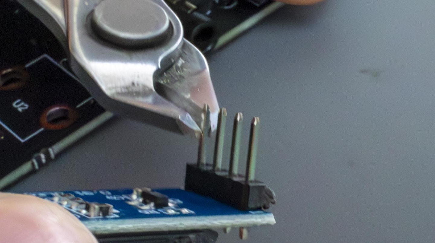 Once the OLED sockets are installed, we can insert the OLED screen. To make it a flush fit, we'll need to trim the pins with some flush cutters: