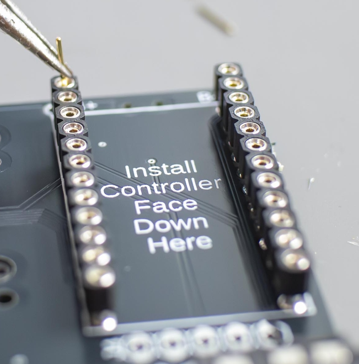 Next is getting our controllers onto the board. First off, insert the sockets into the top side of the PCB  (opposite to the side with the hotswap sockets), soldering the top and bottom pins to secure them.&#x20;